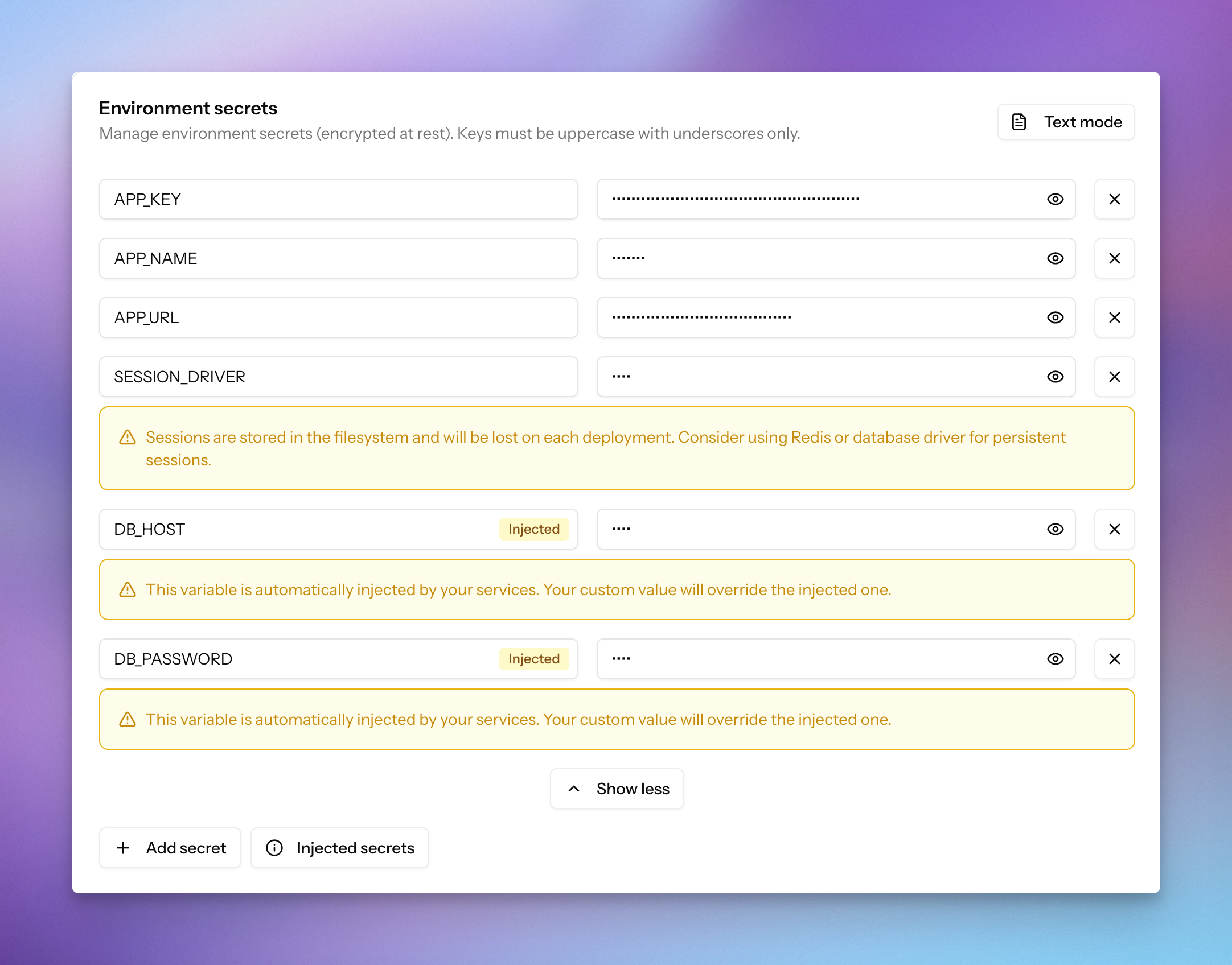 I was migrating an application and just copied & pasted my .env over. Now I did not realize exactly what I did but after a few minutes wondering why my deployments were failing I noticed I ofcourse overwritten my DB_* credentials and also REDIS_* stuff. But I shouldn't have done that :)