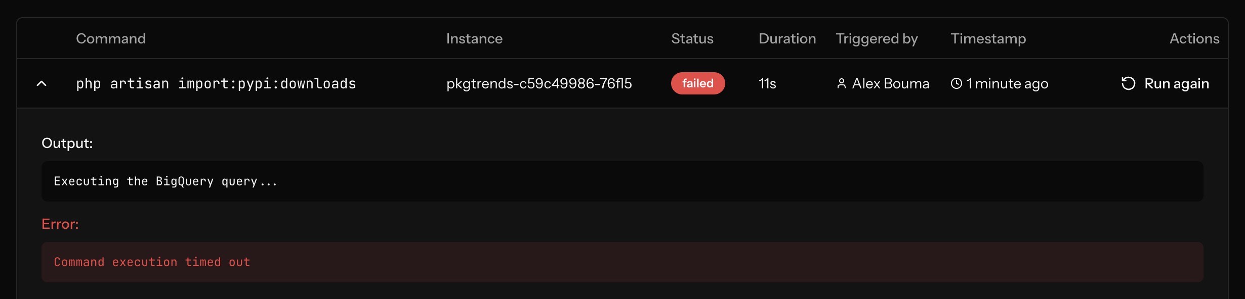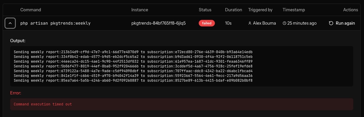 Manual commands seem to timeout after 10s which is a little on the short side OR it actually crashed because of memory issues. As far as I can tell the command completed succesfully though (every line of code ran and the output is exactly what I expected so unsure what actually happened).