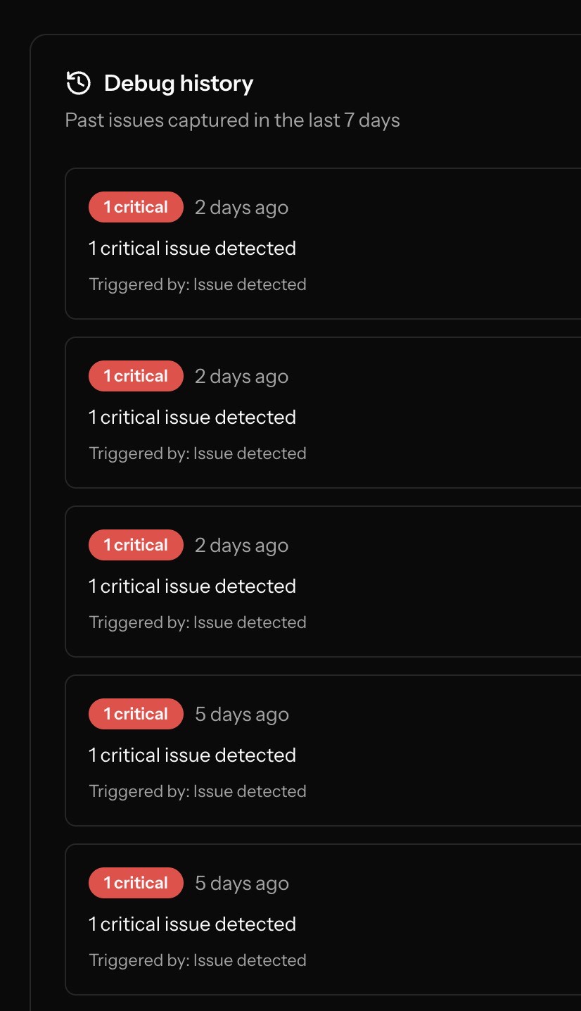 I've added the main reason of the issue into the debug list. I've also added a notification so that every debug snapshot will be sent to your notification channels! To do this, first create a notification channel under your team settings, then per application create a notification channel with the type 'Error'. Once this has been setup a new critical issue detected will be notified to your notification channel.