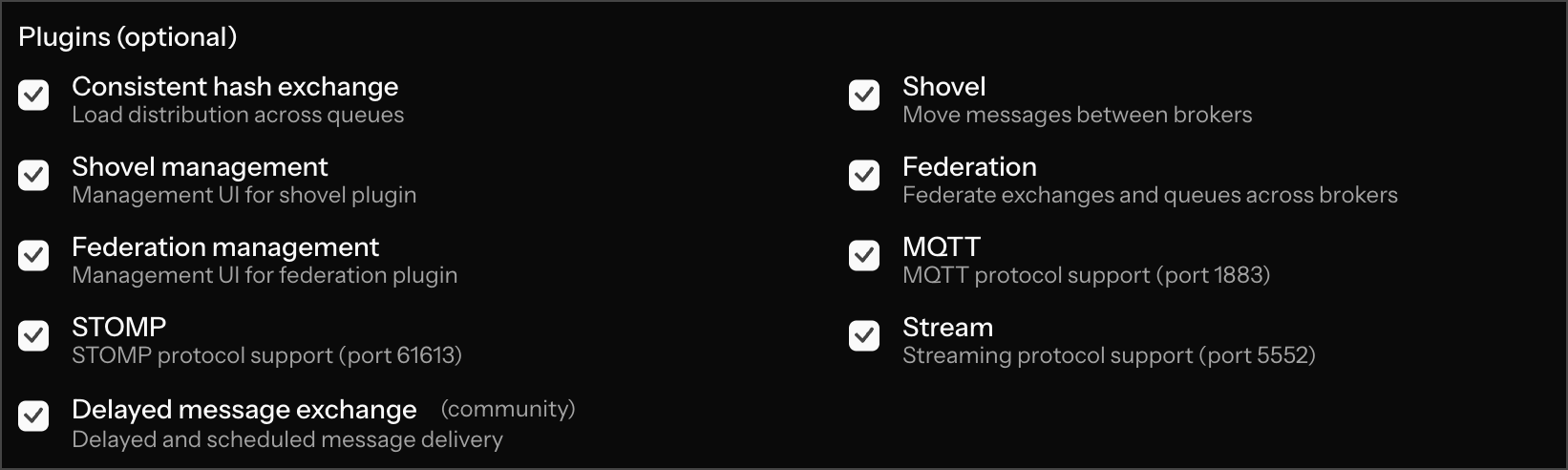 Plugins are now possible to manage inside the RabbitMQ modal. Both normal and community ones. Feel free to request more plugins when you need it!